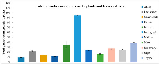Extracts from the studied plants and leaves were quantified for their contents of phenolic compounds and expressed as GAE g−1 of dried plant (Gallic Acid Equivalent). The fenugreek contained the highest content of phenolics (95.21 µg GAE g−1 ± 1.12). The lowest phenolic contents were found in the extracts of the anise (9.05 µg GAE g−1 ± 0.28) and the cumin (9.62 µg GAE g−1 ± 3.26) as shown in Figure 1.
