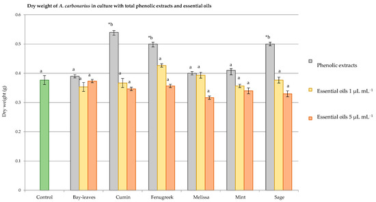 Graphical comparison between phenolic extracts and essential oils at 1 and 5 µL mL−1 on the dry weight of Aspergilluscarbonarius S402 cultured in a synthetic grape medium at 28 °C for 4 days. Statistical differences are indicated as: * = significant difference (p < 0.05). Data with the same letters are not significantly different (p < 0.05).