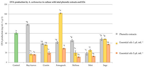 Graphical comparison between the effects of phenolic extracts and essential oils at 1 and 5 µL mL−1 on the ochratoxin A (OTA) produced by A. carbonariuss S402 cultured in a synthetic grape medium at 28 °C for 4 days. Statistical differences are indicated as: * = significant difference (p < 0.05). Data with the same letters are not significantly different (p < 0.05).