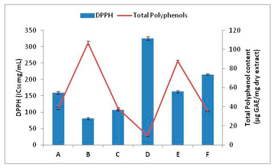 Effect of UAE and MAE extracts (aqueous methanol) on DPPH radical in comparison with Total Phenolic Composition (TPC). Results are expressed as mean ± S.E. Abbreviations used: A: kernels UAE, B: hulls, UAE, C: press residue, D: kernels MAE, E: hulls MAE, F: press residue MAE.