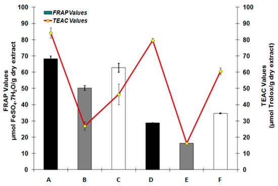 Correlation analysis between total antioxidant capacities measured by FRAP and TEAC assays. Abbreviations used: A: kernels UAE, B: hulls, UAE, C: press residue, D: kernels MAE, E: hulls MAE, F: press residue MAE.