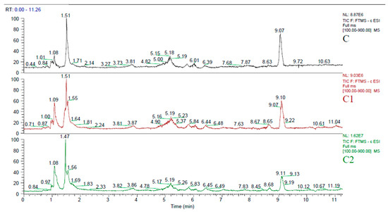 Total Ion Chromatogram (TIC) of kernels (C), hulls (C1), and press residue (C2) extracts.