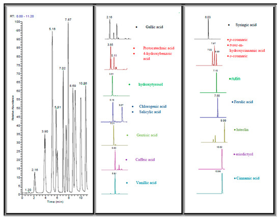 Reagents: Folin-Ciocalteu, sodium persulfate, gallic acid (GA), BHT, 2,2′-azinobis-3-ethylbenzothiazoline-6-sulphonic acid, diammonium salt (ABTS), Trolox, ferrous chloride, and 2,2-diphenyl-1-picrylhydrazyl (DPPH), were purchased from Sigma-Aldrich (Athens, Greece); 2,4,6-Tris (2-pyridyl)-s-triazine (TPTZ) was purchased from Fluka Chemica (Athens, Greece). Dimethylsulfoxide (DMSO), (Merck KGaA, Darmstaadt, Germany) was used as a solvent. Water was obtained from a Milli-Q water purification system (TGI Pure Water Systems, Topway Global, Greenville, SC, USA). Lichrosolv hypergrade for LC-MS acetonitrile was supplied by Merck (Darmstadt, Germany). Water (18.2 MΩ) was from a Milli-Q water system (Millipore, Bedford, MA, USA). Acetic acid was from LGC Standards (Middlesex, UK). Eighteen standard phenolic compounds were used (gallic acid, protocatechuic acid, HydroxyTyrosol, 4-hydroxybenzoic acid, chlorogenic acid, gentisic acid, caffeic acid, vanillic acid, syringic acid, p-coumaric acid, rutin, ferulic acid, trans-m-hydroxycinnamic acid, o-coumaric acid, salicylic acid, luteolin, eriodictyol and cinnamic acid) purchased from Sigma Aldrich.