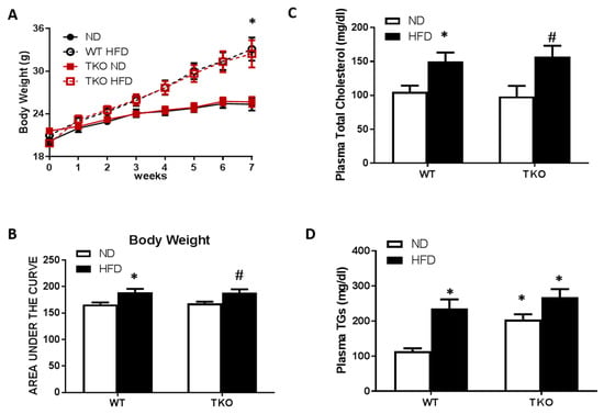 HFD causes similar increases in body weight and dyslipidemia in WT and TKO mice. At 8 weeks of HFD (60% fat), significant increases in weight gain and obesity were observed in both WT-HFD and TKO-HFD compared with their ND-control groups (Figure 1A,B). HFD also caused similar increases in plasma total-cholesterol and triglycerides in WT-HFD and TKO-HFD compared with WT-ND and TKO-ND, respectively. Interestingly, TKO-ND group showed no change in total-cholesterol levels (Figure 1C), but showed a two-fold higher basal level of triglycerides compared with WT-ND (Figure 1D) as part of the phenotype of TKO mice described previously [22].