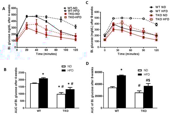 HFD caused early glucose intolerance that was sustained for 8 weeks in WT-mice. Impaired glucose tolerance and insulin resistance were assessed by the area under the curve (AUC) of blood glucose level following IPGTT in all groups. As shown in Figure 2A,B, WT-HFD caused glucose intolerance evident by significant increase in AUC of blood glucose level after 4 weeks that remained significantly higher after 8 weeks of HFD compared to WT-ND (Figure 2C,D). AUC of TKO mice at baseline (TKO-ND) showed significant reduction compared to WT-ND, suggesting higher insulin sensitivity and better glucose tolerance as previously described [22]. HFD affected TKO mice albeit to a different degree, as AUC from TKO-HFD group showed no difference compared to TKO-ND at 4 weeks, suggesting similar insulin sensitivity (Figure 2A,B). After 8 weeks of HFD, there was mild but significant increase in AUC from TKO-HFD compared to TKO-ND, suggesting impaired insulin and glucose intolerance (Figure 2C,D).