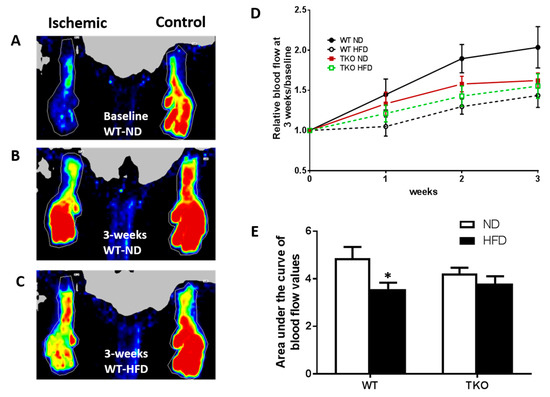 HFD significantly impaired post-ischemic vascular recovery in WT but not in TKO mice. (A) Representative image of blood flow of both limbs from WT-ND immediately following unilateral hindlimb ischemia (zero time-point); (B) Representative image of blood flow of both limbs from WT-ND 3 weeks post unilateral hindlimb ischemia; (C) Representative image of blood flow of both limbs from WT-HFD 3 weeks post unilateral hindlimb ischemia; (D) Relative Blood flow measured at baseline and monitored weekly after hindlimb ischemia from various groups; (E) AUC analysis showed that HFD significantly reduced blood flow in WT-HFD compared to WT-ND. In contrast, AUC levels from TKO-HFD were not significant from TKO-ND (n = 9–12, * p-value < 0.05 vs. WT-ND). 2 × 2-way ANOVA analysis showed diet exerted significant effect (p < 0.05) on vascular recovery.