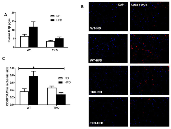 HFD triggered systemic inflammation and infiltration of CD68+ cells in WT, but not in TKO. Inflammation is an essential part of the healing process; however, excessive or sustained inflammation can be detrimental to angiogenesis. As shown in Figure 5A, HDF triggered an increase (1.8-fold) in circulating plasma IL-1β levels in WT-HFD group compared to WT-ND group; however, it did not reach statistical significance (p = 0.059). A 2 × 2-way ANOVA statistical analysis showed a significant effect of TXNIP deletion where TKO showed significant lower levels than WT-mice (p < 0.05) (Figure 5A). Next, in order to assess inflammatory cells infiltration to the site of ischemic injury, the total number of macrophages (CD68+, red) was counted in ischemic sides and normalized to nuclear marker DAPI (blue) from various groups. As shown on Figure 5B,C, HFD-induced obesity led to recruitment of CD68+ cells following ischemia in WT-HFD compared to WT-ND. Nevertheless, deleting TXNIP abolished HFD-mediated macrophage infiltration after limb ischemia (Figure 5B,C). The basal level of CD68+ cells in the non-ischemic leg are shown in Supplementary Figure S2 where HFD exerted a strong trend to increase infiltration of CD68+ Cells compared to ND in WT mice, yet the increase did not reach statistical significance. On the other hand, HFD failed to increase infiltration of CD68+ cells in TKO mice. These results support the potential role of HFD to drive inflammation and the role of TXNIP in abolishing that HFD-mediated inflammation. Deletion of TXNIP did not affect basal inflammatory level where the number of CD68+ cells was not significant between WT-ND and TKO-ND groups. These results support the potential role of HFD to drive inflammation and the role of TXNIP in abolishing that HFD-mediated inflammation.