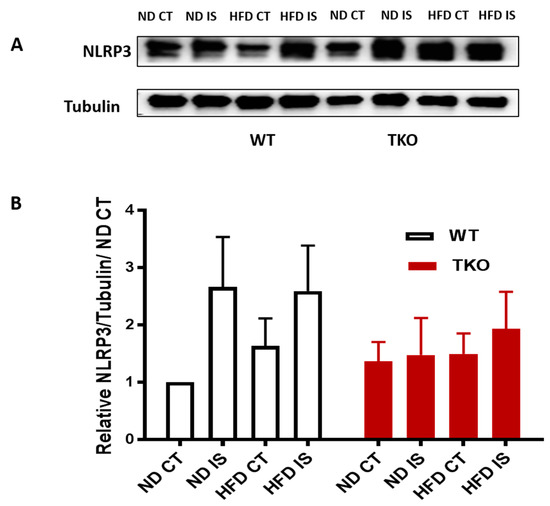 Ischemia increased NLRP3 expression in WT but not in TKO. (A) Representative images of Western blots of NLRP3 and Tubulin in gastrocnemius muscles isolated from WT and TKO mice; (B) 2 × 2-way ANOVA statistical analysis showed a strong trend of increase in NLRP3 expression following ischemia in WT compared to control (n = 4–5, p = 0.06 vs. ND CT). HFD tended to increase NLRP3 expression in WT-HFD compared to WT-ND. 2 × 2-way ANOVA statistical analysis showed lack of gene effect where deleting TXNIP did not alter NLRP3 expression following ischemia or HFD compared to WT-ND CT or TKO-ND CT (n = 5).