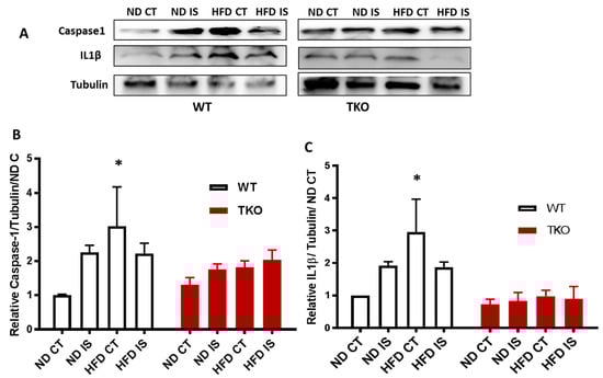 TXNIP deletion prevented HFD-induced NLRP3-inflammasome activation in skeletal muscles; (A) Representative images of Western blots of cleaved caspase-1, cleaved IL-1β and Tubulin in gastrocnemius muscles isolated from WT and TKO mice; (B) 2 × 2-way ANOVA statistical analysis showed that HFD increased activation of NLRP3 inflammasome evident by significant increases in cleaved caspase-1 in WT-HFD compared to WT-ND but not in TKO mice compared to WT-ND or TKO-ND (n = 3–5, * p < 0.05 vs. ND CT); (C) 2 × 2-way ANOVA statistical analysis showed that HFD increased cleaved IL-1β in WT-HFD compared to WT-ND CT but not in TKO mice compared to WT-ND CT or TKO-ND CT (n = 3–5, * p < 0.05 vs. ND CT).