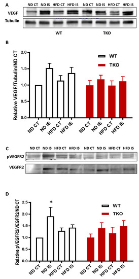 HFD impaired VEGFR2 activation but not levels of VEGF following hind-limb ischemia in WT mice. Next, we investigated the impact of HFD on VEGF levels and its receptor VEGFR2 angiogenic signal. In response to ischemia, VEGF expression showed a slight increase that was not significant compared to the non-ischemic side in all groups (Figure 9A,B). In WT-ND, ischemia triggered significant VEGFR2 activation compared to the non-ischemic control side compared to WT-ND (Figure 9C,D). However, this therapeutic ischemia-triggered angiogenic signal was impaired by HFD, indicated by the loss of VEGFR2 activation in WT-HFD mice (Figure 9C,D). TKO showed similar levels of VEGF expression in response to HFD or ischemia (Figure 9B). TKO mice showed lower basal level of VEGFR2 activation compared to WT similar to prior observation using retinal angiogenesis model [23]. Interestingly, exposure to HFD or ischemia did not alter VEGFR2 activation in TKO mice compared to TKO-ND (Figure 9D).