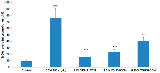 In order to determine the antioxidant activity of YBHS, the TBARS assay was performed using a kit obtained from Cayman Chemical. The homogenized liver samples of control, CCl4, CCl4 plus 25% BHS, CCl4 plus 12.5% BHS, and CCl4 plus 6.25% BHS groups were used. The results of the TBARS assay (Figure 1) indicated that the MDA levels in the three groups with the YBHS treatment were significantly decreased in comparison with the CCl4 group, which had an eight-fold increased MDA level compared to the control. Our results showed no statistical difference in the extent of damage/protection between female and male mice used in this study. The decrease in MDA levels suggests that YBHS is capable of reducing lipid peroxidation.