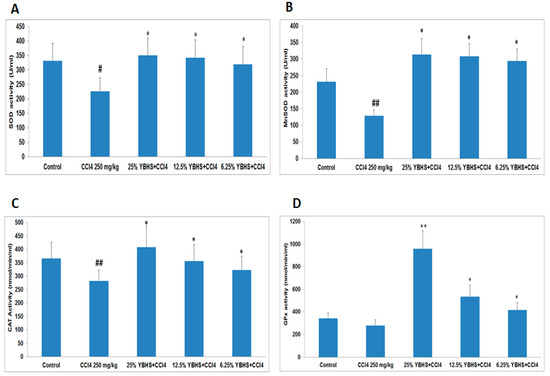 Impact of YBHS on total Superoxide Dismutase (SOD), Manganese Superoxide Dismutase (MnSOD), Catalase (CAT), and Glutathione Peroxidase (GPx) activity in the liver homogenate of ICR mice. (A) SOD activity was significantly reduced by the CCl4 treatment (CCl4 group). Results showed that YBHS extract was able to activate the SOD activity in all YBHS extract treated groups, namely, 25% YBHS + CCl4, 12.5% YBHS + CCl4, and 6.25% YBHS + CCl4 groups, respectively (# p < 0.05 significant compared to control; * p < 0.05 significant compared to CCl4). The 25% YBHS treatment group showed high SOD activity though the difference is not that significant between the three YBHS treatment groups; (B) YBHS extract increased mitochondria SOD (MnSOD) activity in different groups whereas SOD activity was significantly reduced by CCl4 treatment (## p < 0.01 very significant compared to the control). YBHS extract was able to activate SOD activity in 25% YBHS + CCl4, 12.5% YBHS + CCl4, and 6.25% YBHS + CCl4 groups significantly (* p < 0.05 significant, compared to CCl4); (C) CAT activity was significantly reduced by CCl4 treatment (in CCl4 group) (## p < 0.01 very significant compared to the control). On the other hand, the YBHS extract significantly activated the CAT activity in the 25% YBHS + CCl4, 12.5% YBHS + CCl4, and 6.25% YBHS + CCl4 groups (* p < 0.05 significant compared to CCl4). The highest CAT activity was observed in the 25% YBHS treatment group; (D) GPx activity was observed to be reduced by CCl4 treatment (in CCl4 group). YBHS water extract significantly activated the GPx activity in 25% YBHS + CCl4, 12.5% YBHS + CCl4, and 6.25% YBHS + CCl4 groups (** p < 0.01 very significant, * p < 0.05 significant compared to the CCl4 group). The 25% YBHS treatment group showed high GPx activity compared to the other two YBHS treatment groups. Data are represented as mean ± SD.