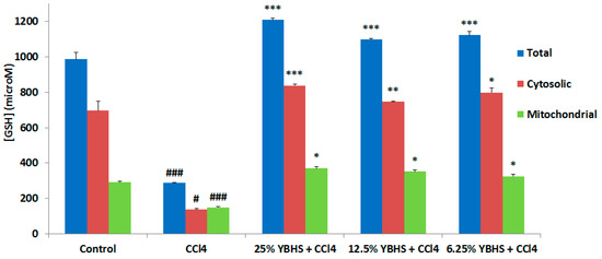 Impact of YBHS on the total (mitochondrial + cytosolic) glutathione (GSH) concentrations in the liver in different groups of mice. In order to confirm our hypothesis that YBHS may increase glutathione levels, the impact of YBHS on total, cytosolic, and mitochondrial samples of homogenized liver samples of the 5 different treatment groups indicated were studied using the Cayman Chemical glutathione assay kit. Glutathione levels were observed to be significantly reduced with CCl4 treatment compared to the control (# p < 0.05 significant, ### p < 0.001 extremely significant compared to the control) in all three fractions of the liver homogenate. YBHS treatment significantly increased (GSH) levels compared to the CCl4 group in the 25% YBHS + CCl4, 12.5% YBHS + CCl4, and 6.25% YBHS + CCl4 groups (* p < 0.05 significant, ** p < 0.01 very significant, *** p < 0.001 extremely significant compared to CCl4 group). Data are represented as mean ± SD.
