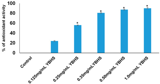 Antioxidant activity of the YBHS aqueous extract. The antioxidant/free radical scavenging activity of YBHS was determined by DPPH (2,2-diphenyl-1-picrylhydrazyl) assay. YBHS aqueous extract (0.25–1.0 mg/mL) shows significant (* p < 0.01) antioxidant activity compared to the control. The YBHS dose that required scavenging of 50% of the DPPH radical was found to be 0.25 mg/mL. Data are represented as mean ± SD.