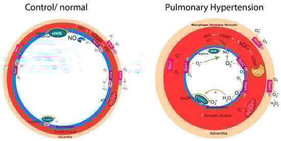 The vasculature of the lungs is a high capacity, low resistance environment that can accommodate and oxygenate the entire cardiac output with each cycle. Normal mean pulmonary artery pressures is in the range of 9–18 mmHg and PH occurs when pressures at rest exceed 25 mmHg [1]. The elevation of pulmonary blood pressure occurs secondary to progressive increases in the resistance to blood flow of pulmonary arterioles or increased venous pressure. Increased pulmonary artery pressure increases stress on the right ventricle which undergoes compensatory hypertrophy [2]. There are many causes of PH which can be divided into 5 groups according to the World Health Organization classification. Type I refers to pulmonary arterial hypertension (PAH) and arises from abnormalities in pulmonary arterioles which can be idiopathic or inherited, drug or toxin induced, connective tissue disorders, human immunodeficiency virus (HIV) infection, portal hypertension, congenital heart diseases, or schistosomiasis. Type II develops from left heart disease including systolic and diastolic dysfunction and valve stenosis. Type III occurs due to lung diseases and resultant hypoxia including chronic obstructive pulmonary disease (COPD), interstitial lung disease, and sleep apnea. Type IV is secondary to blood clots in the lungs. Type V PH is caused by a variety of other diseases including blood disorders, systemic disorders such as sarcoidosis, metabolic disorders, or physical impositions such as tumors which compress pulmonary arteries. The following discussion will focus on the role of reactive oxygen and nitrogen species in pulmonary hypertension [3,4].