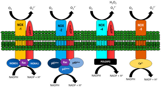 - BelAiba, R.S.; Djordjevic, T.; Petry, A.; Diemer, K.; Bonello, S.; Banfi, B.; Hess, J.; Pogrebniak, A.; Bickel, C.; Gorlach, A. Nox5 variants are functionally active in endothelial cells. Free Rad. Biol. Med. 2007, 42, 446–459. [Google Scholar] [CrossRef] [PubMed]