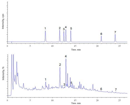Total Ion Chromatogram (TIC) (top) and UV (bottom) at 280 nm of purslane leaves extract. The numbers correspond to the identified peaks: (1) caffeic acid; (2) p-coumaric acid; (3) scopoletin; (4) ferulic acid; (5) quercetin-3-O-rhamnoside; (6) quercetin; and (7) apigenin.