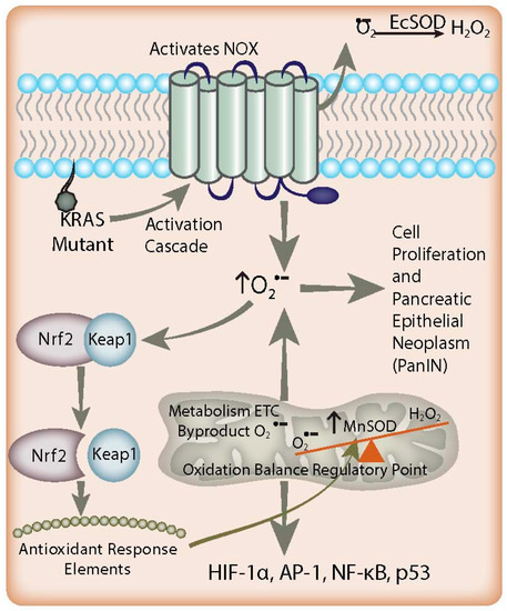Nuclear factor erythroid 2-related factor 2 (Nrf2) is a transcription factor that allows healthy cells to maintain steady states in conditions of oxidative stress to prevent carcinogenesis [83]. In fact, Nrf2 is a master transcription factor thought to be responsible for inducing the expression of numerous antioxidant enzymes [84]. Normally, Nrf2 is bound to the Keap1 protein in the cytosol until oxidative stresses increase within the cell, causing Nrf2 to dissociate from the Keap1 protein [85]. Unbound Nrf2 is then able to translocate to the nucleus where it binds to antioxidant response elements (ARE), transcription factors for key antioxidant enzymes, including MnSOD [85,86]. While Nrf2 function suppresses cancer development in normal cells, abnormal constitutive activation in developing cancer cells can facilitate the protection and propagation of growing tumors [87]. In particular, Nrf2 activation was found to be a key regulator of tumor maintenance in pancreatic cancer [88]. This may seem contradictory to conventional wisdom, which suggests K-ras mutations lead to increased levels of ROS in acinar cells required for tumorigenesis [46]. However, while K-ras mutant cells do lead to downstream generation of ROS, and Nrf2 activity is increased in response [85], there is strong evidence supporting the presence of oxidative damage [45]. To reconcile these observations, it has been proposed that Nrf2 activity helps achieve a cellular redox balance allowing K-ras-induced oxidative stress to facilitate proliferation of PanIN lesions without becoming severe enough to induce senescence or cause toxic DNA damage [45]. Furthermore, Nrf2 activity may be an important source of chemoresistance in pancreatic tumor cells as a constant source of oxidative stress [89,90]. Targeting strategies to lower Nrf2 activity in tumor cells have been proposed that would theoretically eliminate the antioxidant counterbalance to K-ras-induced oxidative stress and remove this potentially important source of chemoresistance. Although there has yet to be full elucidation regarding Nrf2 regulation of any SOD isoform in pancreatic acinar cells, an important link does likely exist.