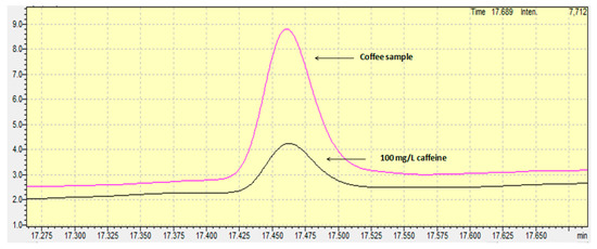 The limit of detection, as provided from the standard error of the intercept of the calibration curve, was found to be equal to 3.1 mg/L or 62 mg caffeine/kg. The limit of quantification was found to be equal to 9.3 mg/L or 186 mg caffeine/kg. Comparing the limits of detection and quantification with those achieved from other works and by other methods, it can be concluded that the values determined in the current work are similar to or slightly worse than others, but they are surely “fit for purpose” regarding the content levels of caffeine in coffee grains. For example, a better limit of detection was achieved compared to the HPLC-UV method proposed by Fernández et al. (2000), and a similar value was determined compared to that achieved by derivative-spectrophotometry as proposed by Alpdogan et al. (2002) [16,17]. On the other hand, the limits of detection were worse than those proposed by Shrivas and Wu (2007), Song (Sherry) and Ashley (1998), and slightly worse than that proposed by Frizzarin et al. (2016), who determined the levels of caffeine using a fully-automated in-syringe dispersive liquid-liquid microextraction [18,19,20].