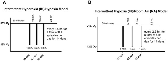 Representation of the two neonatal intermittent hypoxia (IH) paradigms used in this study. Hyperoxia (50% O2) following a brief, repetitive hypoxic event (12% O2) is presented in (A). Normoxia (21% O2) following a brief, repetitive hypoxic event (12% O2) is presented in (B).