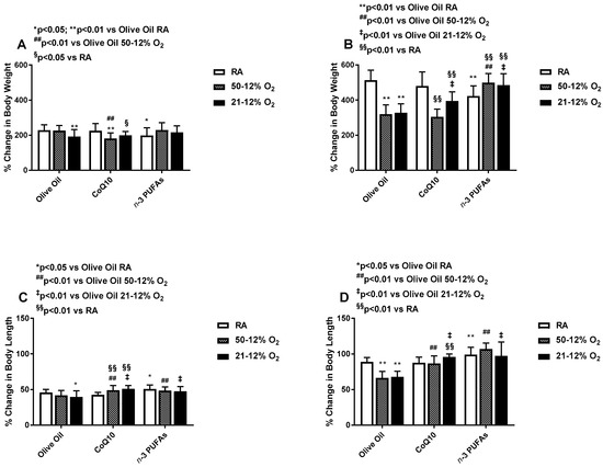 Certified infection-free, timed-pregnant Sprague Dawley rats were purchased from Charles River Laboratories (Wilmington, MA, USA) at 18 days gestation. The animals were housed in an animal facility with a 12-h-day/12-h-night cycle and provided standard laboratory diet and water ad libitum until delivery. Within 2–4 h of birth, newborn rat pups delivering on the same day were pooled and randomly assigned to expanded litters of 18 pups/litter (9 males and 9 females). Gender was identified by the anogenital distance. The expanded litter size was used to simulate relative postnatal malnutrition of ELBW/ELGA neonates who are at increased risk for oxidative stress. Animals were exposed to neonatal IH from P0 to P14 (IH) or allowed to recover in room air (RA) until P21 (IHR). RA littermates were raised in atmospheric oxygen from P0 to P14 or P0 to P21, and served as controls. During IH (P0 to P14), pups were administered daily oral doses of CoQ10 (0.35 mg in 50 µL extra virgin olive oil) purchased from Sigma Aldrich (St. Louis, MO, USA), 50 µL fish oil containing 35 mg total n-3 PUFAs (22 mg eicosapentaenoic acid (EPA); and 13 mg docosahexaenoic acid (DHA)), or 50 µL extra virgin olive oil. Pups were euthanized at P14 or allowed to recover from IH in RA from P14 to P21 (IHR). Total body weight (grams) and linear growth (crown to rump length, cm) were recorded at P0, P14, and P21 to determine percentage change and weight accretion from birth. Weight accretion evidenced by percentage changes in body weight and linear growth were calculated as weight or length at the end of the experiment (P14 or P21) minus weight or length at birth (P0) divided by the weight or length at birth × 100. Percentage change in body weight was used to standardize differences in birth weight.