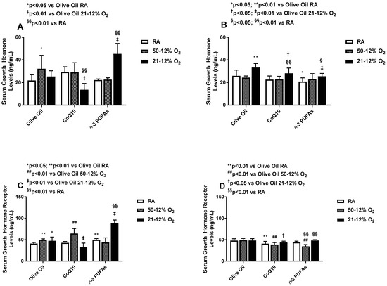 Effects of neonatal IH with Co-Q10 or n-3 PUFA supplementation on serum growth hormone panels (A,B) and growth hormone receptor panels (C,D) levels. Groups are as described in Figure 2. Data are expressed as mean ± SD (n = 8 samples/group).