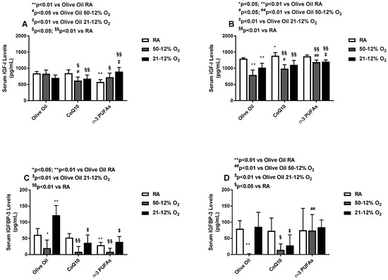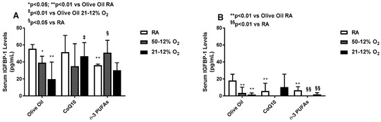 Supplementation with n-3 PUFAs in RA, but not IH, resulted in lower serum IGF-I levels (Figure 4A). CoQ10 decreased serum IGF-I in 50–12% O2 compared to olive oil and treatment in RA, while treatment in 21–12% O2 did not differ from olive oil, but was lower than treatment in RA (Figure 4A). n-3 PUFA treatment elevated serum IGF-I levels in the IH groups compared to RA, but lowered it in the RA group compared to olive oil (Figure 4A). During IHR post treatment, levels of IGF declined in all supplemented group exposed to IH compared to their RA counterparts, but supplementation with n-3 PUFAs resulted in higher serum IGF-I in both IH groups, compared to the RA controls (Figure 4B). Both CoQ10 and n-3 PUFAs decreased serum IGFBP-3 in all oxygen environments compared to RA. Exposure to 50–12% O2 resulted in major reductions in serum IGFBP-3 levels, while exposure to 21–12% O2 caused robust elevations with olive oil supplementation compared to RA as well as the CoQ10 and n-3 PUFAs littermates (Figure 4C). During IHR, the levels of IGFBP-3 further declined with olive oil supplementation in 50–12% O2, and with CoQ10 treatment in both IH paradigms compared to RA. Supplementation with n-3 PUFAs preserved serum IGFBP-3 levels during IHR in all oxygen environments (Figure 4D). During treatment in IH, serum IGFBP-1 levels declined with n-3 PUFAs in RA compared to olive oil, and with olive oil treatment in both IH paradigms compared to RA (Figure 5A). Treatment with CoQ10 increased serum IGFBP-1 in 21–12% O2, while the levels were elevated with and n-3 PUFAs in 50–12% O2 compared to RA (Figure 5A). During IHR post treatment, serum IGFBP-1 levels declined significantly in all groups. In RA, treatment with CoQ10 and n-3 PUFAs resulted in lower IGFBP-1 levels compared to olive oil, in 50–12% O2, CoQ10 and n-3 PUFAs abolished serum IGFBP-1 levels, and in 21–12% O2, CoQ10 non-significantly elevated serum IGFBP-1 levels (Figure 5B).