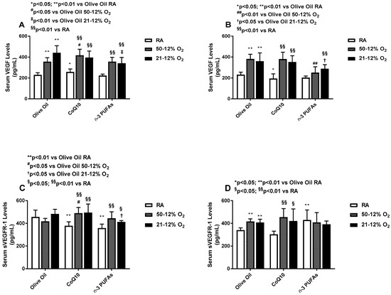 Serum VEGF levels increased significantly during all treatments in both IH paradigms (Figure 6A) compared to RA, and the effect remained sustained during IHR post treatment although n-3 PUFA treatment in both IH groups resulted in much lower levels compared to RA and olive oil (Figure 6B). sVEGFR-1 levels increased with CoQ10 and n-3 PUFA supplementation in the IH groups compared to their RA counterparts (Figure 6C). In IHR post treatment, n-3 PUFA supplementation in RA caused a significant elevation in serum sVEGFR-1 compared to olive oil while the levels remained elevated in both IH groups supplemented with olive oil and CoQ10 compared to RA (Figure 6D).