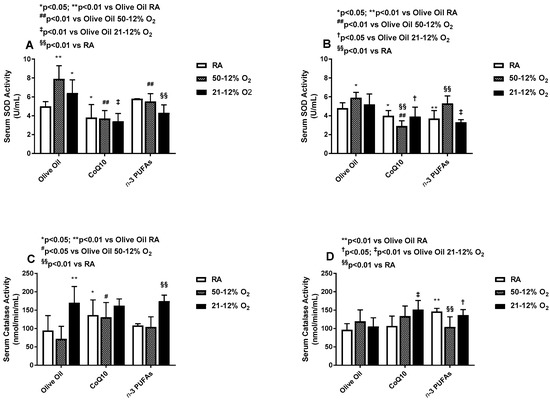 Effects of neonatal IH with Co-Q10 or n-3 PUFA supplementation on serum superoxide dismutase panels (A,B) and catalase panels (C,D) activities. Groups are as described in Figure 2. Data are expressed as mean ± SD (n = 8 samples/group).