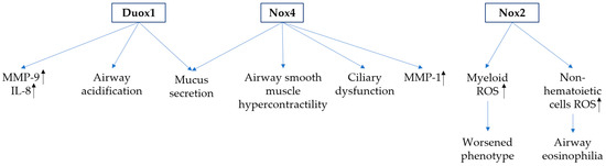 Duox exist as two isoforms, of which Duox1 is primarily expressed in the tracheobronchial epithelium, whereas Duox2 has been detected in salivary or submucosal glands [109,110,111]. In addition to postulated roles in airway host defense, recent studies have suggested alternative functions of airway epithelial Duox1 in mediating asthma. Mucous metaplasia and airway remodeling as hallmarks of allergic asthma have been associated with expression and activation of epidermal growth factor receptor (EGFR) signaling [112]. Constitutive EGFR activation has been associated with cysteine oxidation, which was diminished by pharmacologic or genetic inhibition of the epithelial Duox1 [113]. Targeted inhibition of airway Duox1 in mice reversed symptoms of asthma [113]. Meanwhile, Duox1 regulated mucus secretion through mediating TNF-alpha-converting enzyme (TACE) cleavage into soluble TGF-α, which mediates mucin expression [114]. Other mechanisms of Duox1 regulation of asthma include enhanced inflammatory mediators including IL-8 or matrix metalloprotease-9 (MMP-9) [12,115] and increased airway acidification [116].