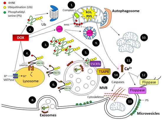 Dox generates extensive quantities of oxidized and ubiquitinated proteins while it disrupts multiple pathways of protein quality control as discussed above. Because EV biogenesis and protein quality control pathways are interconnected, EVs serve as an alternative pathway to remove toxic proteins from cells during Dox-induced oxidative stress. Indeed, Dox can promote EV release in several ways. Dox activation of p53 can increase MVB production via TSAP6 activation [,]. In addition, Dox disrupts Ca2+ homeostasis in cardiomyocytes by interfering with the electron transport chain, leading to the potential collapse of the mitochondrial membrane []. Inability to maintain the mitochondrial membrane potential inhibits Ca2+ influx into mitochondria, which results in an elevation of cytosolic Ca2+, a key event that induces MV release. Lipid peroxidation by Dox may affect membrane curvature and promote EV formation, as evidenced by the photooxidation of the artificial lipid membrane, inducing the alteration of its physical property, in which the hydroperoxyl group increases the area of the lipid membrane, thus forming membrane budding []. The effect of Dox on protein quality control pathways as well as EV biogenesis is summarized in Figure 1.