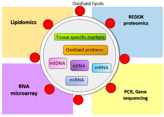 Cellular oxidative stress leads to the production of oxidatively modified molecules such as oxidized lipids, oxidized proteins, and mitochondrial DNA (mtDNA) fragments, which are sorted to EVs for removal. Those oxidized molecules as well as apoptotic nuclear DNA and tissue specific proteins, mRNA and miRNA, can identify the origin as well as the oxidative status of the releasing cells. Several methods, such as lipidomics, REDOX proteomics, RNA microarray, PCR, and gene sequencing, can be applied to discover the potential molecule to be used as a certain disease biomarker.