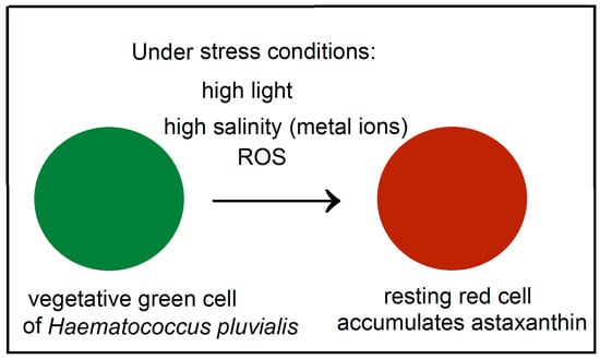 Astaxanthin, belonging to the xanthophyll class of carotenoids, is well known for its unusual high antioxidant activity. Astaxanthin accumulates in Haematococcus pluvialis green microalga in open pond systems such as natural waters (lakes, lagoons, ponds) and artificial ponds specially designed for cultivation of alga (raceway ponds). Haematococcus pluvialis is the richest source of natural astaxanthin and is used to feed livestock and fish, and as a source of biofuel. For example, Kauai, Hawaii has one of the largest algae biofuel production facilities in the United States. The massive astaxanthin accumulation in Haematococcus pluvialis (Figure 1) is a cellular response to stress conditions such as bright light, high salinity, high carbon/nitrogen ratio and low availability of nutrients (Figure 1). Astaxanthin is known to play a protective role in response to these environmental stress conditions which would be deleterious to many other microalgae. Astaxanthin production can be induced by low nitrate or phosphate, high temperature or light, or the addition of sodium chloride in the culture medium [1,2,3].