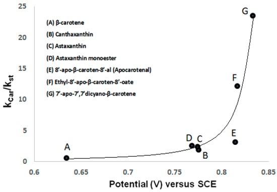 We have shown [18] that the first oxidation potential increases from 0.634 V (versus SCE) for β-carotene with no accepting electron groups to 0.775 V for canthaxanthin and 0.768 V for astaxanthin, both with electron accepting groups (Table 2). Using electrochemical measurements in combination with EPR spin trapping studies, we have found that with increasing first oxidation potential of the carotenoid molecule, the relative scavenging ability (Kcar/Kst) towards peroxyl radicals •OOH radicals formed in a Fenton reaction increases [20]. Determined values of Kcar/Kst [20] are listed in Table 2 and were used to show the direct relationship between the first oxidation potential and the scavenging ability of carotenoids (Figure 2). Figure 2 shows the higher antioxidant ability of astaxanthin when compared to a carotenoid with low oxidation potential such as β-carotene. It is also shown that the scavenging ability of the ester carotenoid ethyl-8′-apo-β-caroten-8′-oate (0.816 V) and that of a carotenoid containing cyano groups, 7′-apo-7′,7′-dicyano-β-carotene (0.833 V), increases by a factor of 4 and by a factor of 8, respectively, versus that of the aldehyde 8′-apo-β-caroten-8′-al (0.814 V). The ability of carotenoids to scavenge peroxyl radicals •OOH increases significantly with an increase in the redox potential [20].