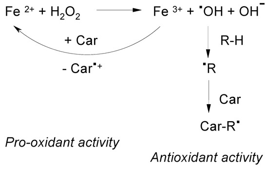 Carotenoids can increase or decrease the total yield of free radicals produced in a Fenton reaction [21] depending on their oxidation potential and the nature of the free radical (Figure 3). Figure 3 presents the Brutto formula of the Fenton reaction used in [21] to illustrate the mechanism of •OOH radical formation in excess of hydrogen peroxide H2O2 [21]. According to the modern point of view [22] the intermediates of the Fenton reaction are high valent ferryl species. At present, the formation of the •OH hydroxyl radical in this reaction is still under discussion. In favor of the •OH radical formation are the results of more recent EPR spin trapping experiments using the OH selective TMIO (2,2,4-trimethyl-2H-imidazole 1-oxide) spin trap in the absence and in the presence of dimethyl sulfoxide (DMSO) [9]. Possible reactions, rate constants and the time course during the Fenton reaction were provided in reference 20, the process being monitored optically. In a carotenoid-driven Fenton reaction [21] a carotenoid with a low oxidation potential can have a pro-oxidant activity increasing the total radical yield (KCar/Kst << 1). Because of its lower oxidation potential β-carotene has the ability to reduce Fe3+ more easily. Astaxanthin, with the higher oxidation potential acts as an antioxidant decreasing the total radical yield (KCar/Kst > 1).
