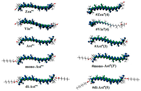 The most favorable location for proton loss from the radical cation to form a neutral radical occurs at the cyclohexene ends of the carotenoids. This proton loss extends the conjugation length providing additional stability and longer lifetime for the quenching neutral radical. Proton loss for Zea•+ to form #Zea• is most favorable at C4 (or C4’ by symmetry) generating the proton loss neutral radical #Zea• (4) (or #Zea• (4’), where the position for proton loss is indicated in parenthesis. The unpaired spin density distributions of Zea•+ radical cation and that of most stable neutral radical #Zea• (4) is shown in Figure 5, along with those for other carotenoids such as violaxanthin, astaxanthin, and its monoester and diester, for comparison. Notice in the case of violaxanthin neutral radical #Vio• (4) that its unpaired spin density is localized on the C4, C5 and C6 atoms. The epoxide group at positions C5–C6 raises the energy barrier for proton loss at the cyclohexene end making proton loss unfavorable.