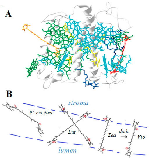 A correlation between the quenching ability of the four carotenoids lutein, zeaxanthin, violaxanthin and 9’-cis neoxanthin present in LHCII (Figure 6) and their ability to form proton loss neutral radicals was found [41]. Zeaxanthin and lutein radical cations known as quenchers in photobiological studies formed neutral radicals on our siliceous solid supports, while violaxanthin and 9’-cis neoxanthin, that are nonquenchers, did not form proton loss neutral radicals on solid supports [41,42,43]. Interestingly, the location of zeaxanthin and lutein in LHCII, near the aqueous proton-accepting lumenal and stromal regions, is also convenient for proton loss so that a radical cation would easily form a proton loss neutral radical (Figure 6). Zeaxanthin and lutein radical cations can thus loose a proton to the lumenal and stromal regions of the thylakoid membrane while violaxanthin and 9’-cis neoxanthin cannot because their structures contain epoxy group(s) and the allene bond that prevent proton loss at the cyclohexene ends.