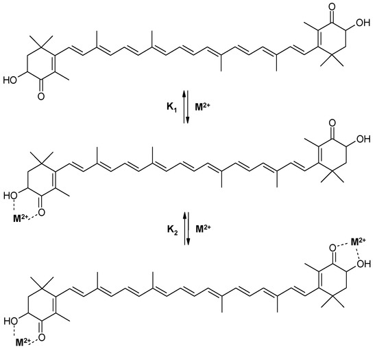 We have found [12] that astaxanthin forms stable chelate complexes with metal ions Fe2+, Zn2+, and Ca2+ which produce significant changes in astaxanthin’s absorption spectrum. The astaxanthin absorption maximum shifts in the presence of Fe2+ from 480 nm (pure astaxanthin) to 492 nm (chelate complex) simultaneously with the appearance of a shoulder at 520–700 nm. Similar changes were detected for the Ca2+ and Zn2+ complexes making them better filters of visible light than astaxanthin itself. Stability constants of astaxanthin chelate complexes with different divalent metal ions have been measured optically in ethanol solution. It was found [12] that both 1:1 and 2:1 chelate complexes (metal: astaxanthin) are formed in two steps with different equilibrium constants, K1 and K2 (Scheme 1). Values for stability constants for all metal complexes are presented in Table 1, the stability constants K1 for complexes with 1:1 stoichiometry being larger than the stability constants K2 for complexes with 2:1 stoichiometry. It was found that at low salt concentrations (<0.2 mM) in an ethanol solution, the complex of astaxanthin with metal ions exists mainly with 1:1 stoichiometry. At high concentration of salt (>0.2 mM) a 2:1 metal to astaxanthin complex is formed.