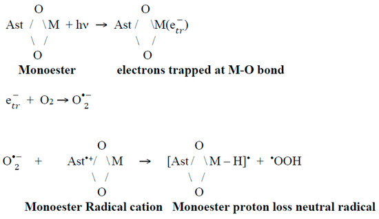 We can propose that a second route of neutral radical of astaxanthin formation might be the reaction of the radical cation with the superoxide radical O. Different studies [59,65,66] demonstrate the reason for the large increase in neutral radicals: that is the abstraction of protons at the ends of the structure (proton at C3 and C3’ position) from the Ast•+ radical cation or even the astaxanthin molecule by the reaction with the O generated by light irradiation. These results are critical for the photo protection of astaxanthin in salty ponds. For example, the presence of the astaxanthin monoester and light produces trapped electrons at the metal-oxygen bond that can react with surface O2 to produce O. This radical can abstract a proton from the carotenoid radical cation to generate a quenching proton loss neutral radical (Scheme 3).