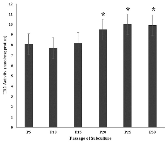As seen from Figure 1, although there were no significant changes in TR2 activity in pre-senescent cells at P5, P10, and P15, there were slight but significant increases of similar magnitude in the enzyme activity in senescent P20, P25, and P30 cells. Activities equaled 8.08 ± 0.44, 7.71 ± 0.45, 8.22 ± 0.55, 9.50 ± 0.58, 10.0 ± 0.84, and 9.90 ± 0.82 nmol/min/mg protein for P5, 10, 15, 20, 25, and 30 cells, respectively (p < 0.05 upon comparison of the activities in senescent P20, 25, and 30 cells against that of pre-senescent P5 young controls).