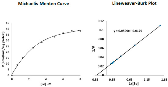 Knowledge regarding the mechanisms of cellular Se uptake is very limited but likely occurs via multiple membrane transporters, which vary according to its chemical form. In human erythrocytes, anion exchanger 1 (AE1) was shown to be involved in selenite transport [39]; it also facilitates the transport of the phosphate, sulfate, and bicarbonate. In another study, the monocarboxylate transporter Jen1P was shown to transport selenite in yeast [40]. Furthermore, it was demonstrated that selenite has a lower transport rate than its reduced form in yeast [41]. Although Se uptake by fibroblasts (for which no data is available) is not a focal issue of this study, Table 2 data indicated that whereas MEM2 and MEM8 incubated pre-senescent P5 cells required 4h to maximise TR2 activity, early-senescent P20 and senescent P30 cells required 6 and 8 h, respectively. In addition, such maximal enzymes activities were maintained when cells were incubated with the same media for up to 12 h. This suggested that Se uptake by cultured fibroblasts is a time-dependent saturable process which could be transporter-mediated. Furthermore, Table 2 results indicated that P20 and P30 cells incubated with MEM8 (8.0 µM Se) for 6 and 8 h, respectively, exhibited enhanced and much higher TR2 activities compared to those documented when the cells were incubated with MEM2 (1.25 µM Se) for the same time periods. This suggested that Se uptake by cultured fibroblasts is also dose-dependent, and further supports the notion that Se uptake and utilisation is significantly increased in early-senescent P20 cells and maximised in P30 senescent cells near the end of their proliferative life span. To this end, results of the present study showed that the Km values of Se with respect to TR2 activity equaled 3.34 and 4.98 µM for P20 and P30 cells, respectively, with corresponding TR2 Vmax values of 55.8 and 96.1 nmol/min/mg protein (Figure 3 and Figure 4).