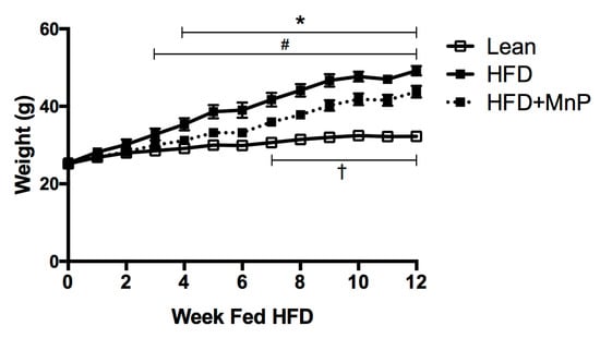 MnP treatment reduces weight gain in high fat diet (HFD)-fed mice. Over 12 weeks of HFD feeding, weights were recorded for Lean (empty squares, solid line), HFD (filled squares, solid line), and HFD + MnP (filled squares, dashed line) mice, n = 5 mice per group. Data is displayed as mean ± SEM. Significance was calculated by two-way ANOVA with a Tukey post-test of multiple comparisons. Significant differences were observed between Lean and HFD starting at 3 weeks (#), between HFD and HFD + MnP starting at 4 weeks (*), and between Lean and HFD + MnP starting at 7 weeks (†), all lasting the duration of the experiment.