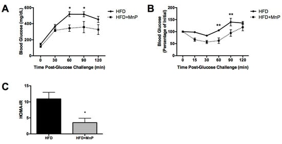 After 10 weeks of HFD feeding, with and without MnP treatment, Intraperitoneal glucose tolerance test (IPGTT) and Insulin tolerance test (ITT) were performed, in order to assess glucose intolerance and insulin resistance. MnP treated animals exhibited significant improvements in glucose tolerance, 60 and 90 min post-glucose challenge, as compared to HFD mice (p ≤ 0.05) (Figure 4A), indicating enhanced glucose clearance. Improved glucose tolerance with MnP treatment also correlated with improved insulin sensitivity at the same time points (p ≤ 0.01) (Figure 4B). Further, an estimation of insulin sensitivity was calculated using HOMA-IR. The HOMA-IR score is derived from a calculation accounting for the presence and extent of insulin resistance [43]. A higher HOMA-IR score translates to increased insulin resistance. Here, the HOMA-IR score was significantly decreased (p ≤ 0.05) with MnP treatment compared to HFD alone (Figure 4C). These results indicate enhanced insulin sensitivity and improved glucose clearance due to MnP treatment, which can be attributed in part to the reduction in hepatocellular lipids exhibited by these animals (Figure 3).