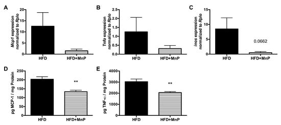 The redox-dependent regulation of inflammation is mediated through NF-κB-dependent pro-inflammatory cytokine production. These cytokines are well-accepted mediators of hepatic insulin resistance and are upregulated in obesity [13,14]. Levels of the pro-inflammatory cytokine, TNFα, a potent inhibitor of insulin signaling and therefore a major contributor to insulin resistance, are elevated in obese subjects [54,55]. MCP-1 is a chemokine that aids in this process by recruiting macrophages into liver and adipose tissue, fueling the inflammatory cascade [56,57]. To determine the effects of MnP on NF-κB-mediated cytokine production, the expressions of MCP1 and TNFα were measured in the livers of mice, treated with or without MnP, on HFD. We observed diminished levels of hepatic MCP1 and TNFα gene expressions with MnP treatment (Figure 7A,B). To confirm, we measured the protein levels of these pro-inflammatory mediators from liver tissue and saw significant decreases (p ≤ 0.01) in HFD + MnP mice (Figure 7D,E). Previous studies have shown that NF-κB-dependent inducible nitric oxide synthase (iNOS) plays an important role in insulin resistance [58] and that liver-specific inhibition of iNOS reverses obesity-induced insulin resistance [59,60]. Here, we showed diminished levels of hepatic iNOS expression upon redox modulation with MnP (Figure 7C). These data further support the hypothesis that redox modulation by MnP inhibits the NF-κB-dependent production of pro-inflammatory cytokines.