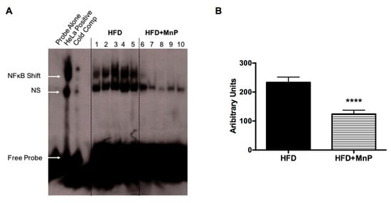 Previously, we demonstrated, in vitro, that MnP prevented the binding of NF-κB to its response element site, more specifically through blocking of NF-κB p50 to its cognate DNA response element [22]. In order to define the mechanism for the anti-inflammatory effects observed with MnP treatment (Figure 7), we determined the degree of NF-κB binding in nuclear liver extracts from HFD fed mice treated, with or without MnP, by EMSA. A significant reduction in hepatic nuclear NF-κB binding was observed with MnP treatment of HFD fed mice (p ≤ 0.0001) (Figure 8). These data recapitulate, for the first time in an in vivo model, the blocking of NF-κB DNA binding, correlating with the anti-inflammatory and oxidoreductase mechanism of MnP, previously reported in vitro [22].