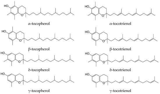 Tocochromanols, a subset of isoprenoids better known as vitamin E, include four tocopherols and four tocotrienols (Figure 1). These lipophilic antioxidants are synthesized by plants and other photosynthetic organisms only [1]. The base of the molecule of tocopherol is a hydroxychromane nucleus upon which a phytyl saturated chain of 16 carbon atoms is fixed. Three of these carbons are asymmetric, which entails the possibility of the existence of eight stereoisomers. The different tocopherols are distinguished from each other by the number and the position of the methyl groups attached to the nucleus. RRR-α-tocopherol is the most common in nature and the tocopherol with the highest biological activity. In biological tests for vitamin evaluation (fetal resorption tests), β and γ-tocopherol display a reduced vitamin activity (from 15 to 30%), and δ-tocopherol is almost inactive. Tocotrienols are distinguished from tocopherols by the presence of three double bonds on the side chain. Only α and β-tocotrienol appear to have a significant vitamin activity [2].