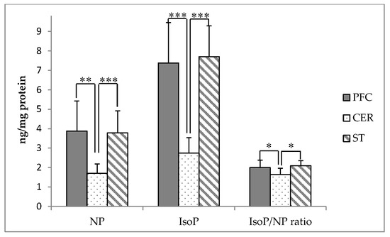 - Montine, T.J.; Montine, K.S.; Reich, E.E.; Terry, E.S.; Porter, N.A.; Morrow, J.D. Antioxidants significantly affect the formation of different classes of isoprostanes and neuroprostanes in rat cerebral synaptosomes. Biochem. Pharmacol. 2003, 65, 611–617. [Google Scholar] [CrossRef]