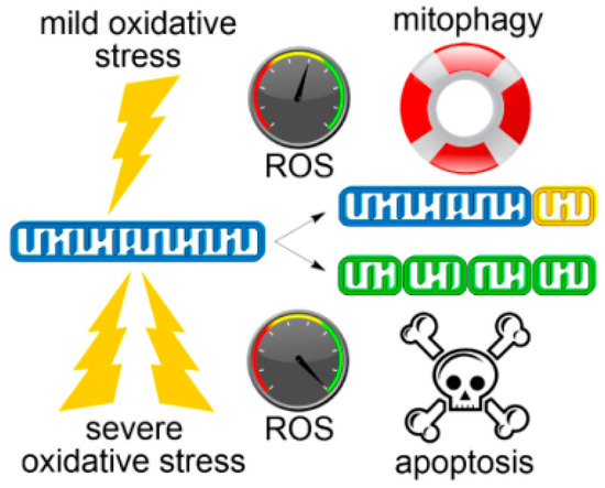 Changing cell fates depending on oxidative damage extent and mitochondrial dynamics. Under mild oxidative stress conditions (top), clearance of defective mitochondrion (yellow) by mitophagy reduces ROS levels and enhances cell survival. Acute oxidative stress (bottom) promotes extensive mitochondrial fission and dysfunction that ultimately leads to elevated ROS, loss of mitochondrial integrity (green) and apoptotic cell death.