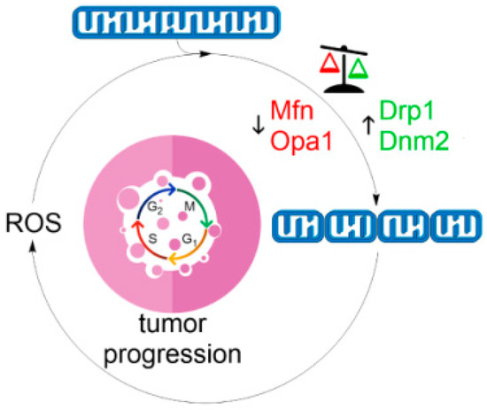 Numerous reports implicate Ras in modulating mitochondrial ultrastructure [153]. For example, Kashatus and Nascimento et al. reported that ERK2-mediated activating phosphorylation of Drp1 at Ser616 was required for mitochondrial fragmentation and tumor cell proliferation [154]. Similar effects of oncogenic Ras activation on the dynamics of mitochondria and tumor progression have been observed in cells and human melanoma cell lines [155]. In this setting, ERK1/2-dependent Drp1 activation promotes mitochondrial fission, ∆Ψm loss, and mitochondrial ROS generation during RasG12V-driven tumor transformation. This phosphorylation mark is also used by cyclin B-Cdk1 to simulate fission at mitosis to allow the efficient partitioning of mitochondria in daughter cells [156]. Overexpression of constitutively-active HrasG12V mutant or MAPK activation was associated with increased mitochondrial fission and tumor growth in both in vitro human pancreatic cancer and mouse xenograft models. This fission may be stimulating cell division by generating enough ROS to serve as both a growth catalysis and mitochondrial segregation. Drp1 depletion by shRNA-mediated knockdown or expression of phosphorylation-defective mutant prevented mitochondrial fission and Ras-induced growth. Similarly, pharmacological inhibition of the MAPK pathway led to Drp1 downregulation, increased mitochondrial fusion, and metabolic activity. These findings suggest that mitochondrial dynamics could be a viable therapeutic strategy for Ras-driven neoplasia.