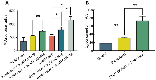 3.1. GC4419 Increases the Rate of Oxygen Consumption and Ascorbate Radical Steady-State Concentration in Systems Containing AscH−